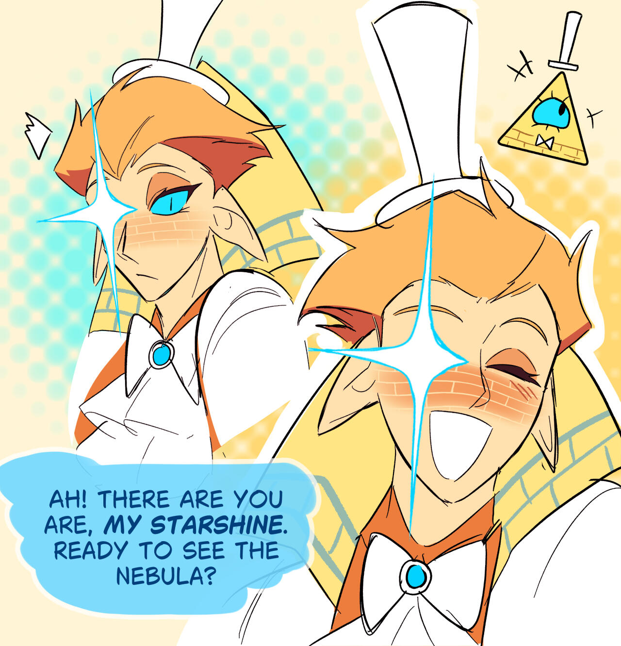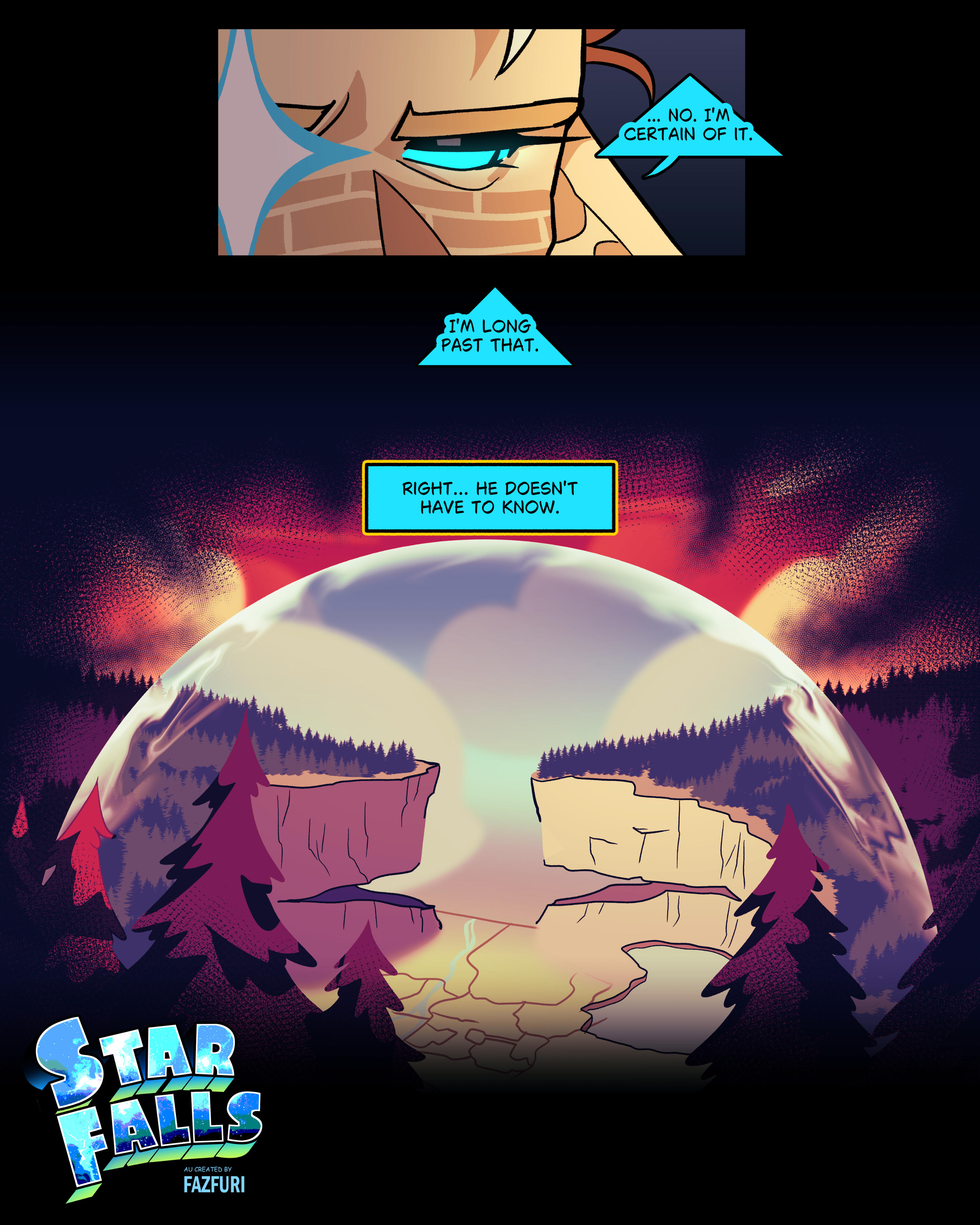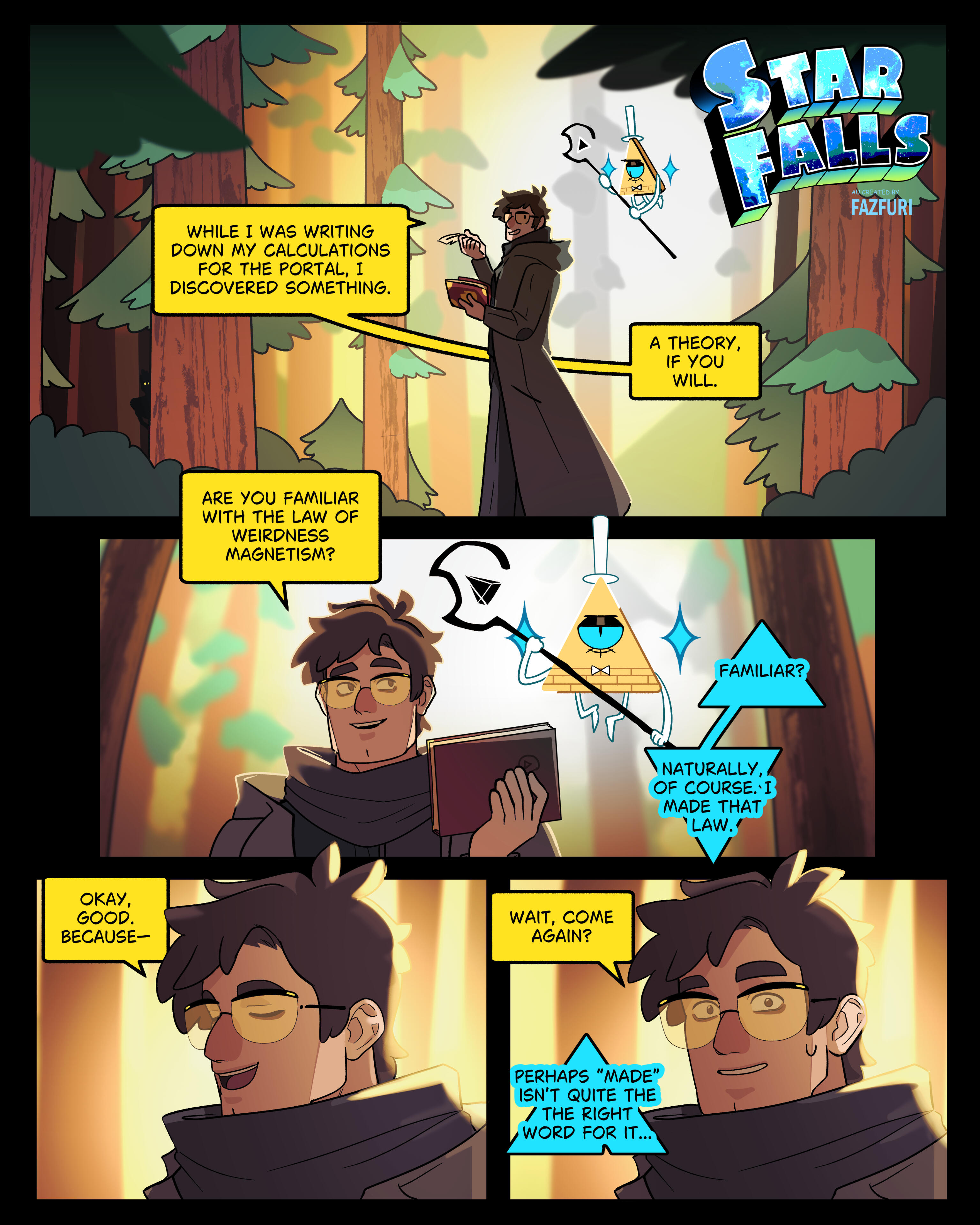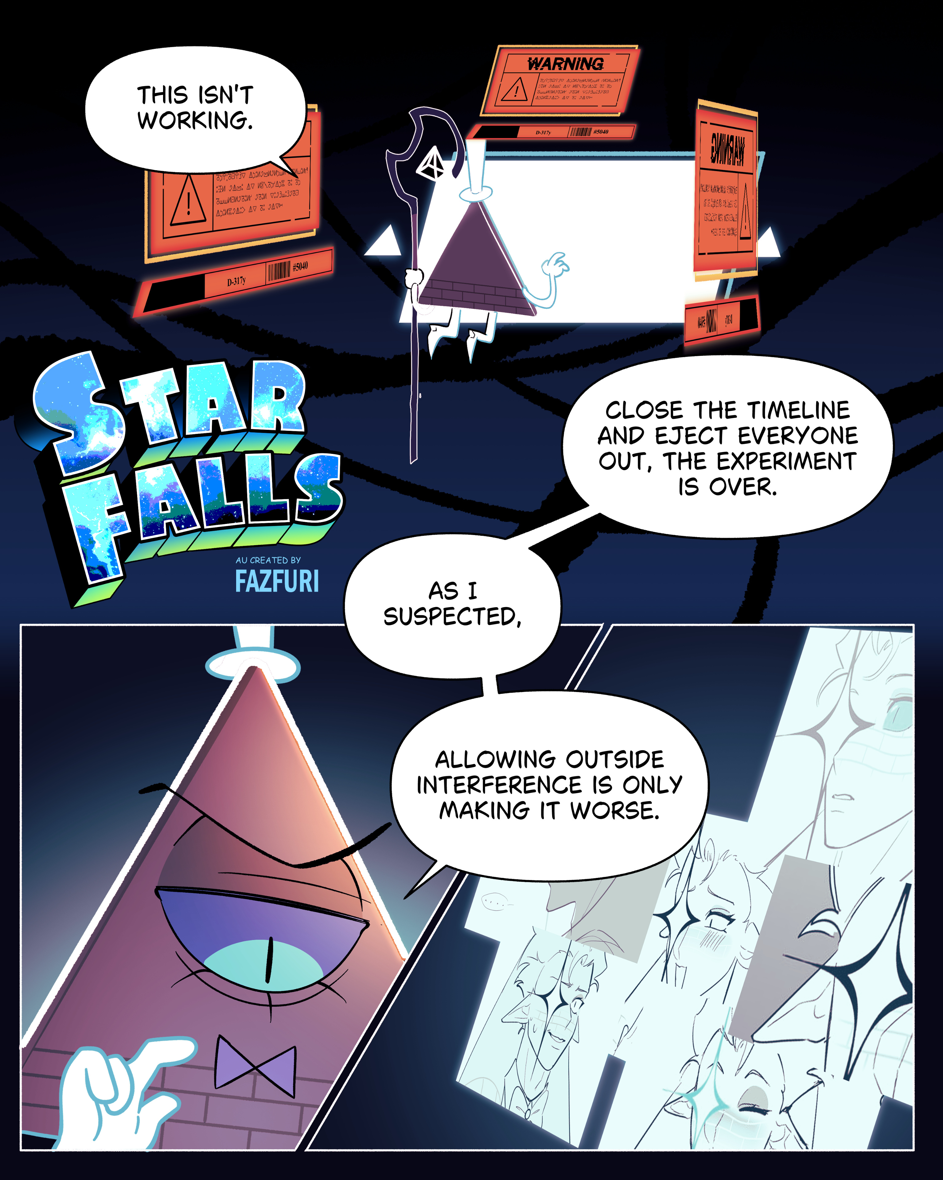 Star Falls is a Gravity Falls AU, also known as the "Deity" Bill Cipher AU. In parallel with the original Gravity Falls series, this one follows a similar narrative but with Bill Cipher playing the role of the "good guy" rather than the evil entity we knew. This AU draws a lot of inspiration from the Book of Bill, most especially from the chapters of Bill's history.